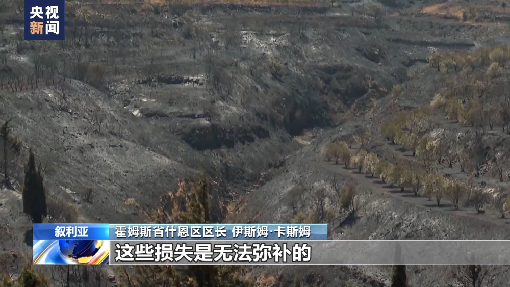 霍姆斯省什恩區(qū)區(qū)長 伊斯姆·卡斯姆:大火蔓延了約430平方公里,這里種植了橄欖、蘋果、葡萄、無花果樹等,損失非常巨大。我們可以看到橄欖樹都被燒焦了,果農(nóng)損失了大概20年的橄欖產(chǎn)量,這個地區(qū)往年能產(chǎn)出約1.6萬升的橄欖油,約1.6萬升的蘋果醋,還有蘋果都能出口到鄰國。今年我們將面臨橄欖油和蘋果產(chǎn)量降低,這些損失是無法彌補(bǔ)的。
