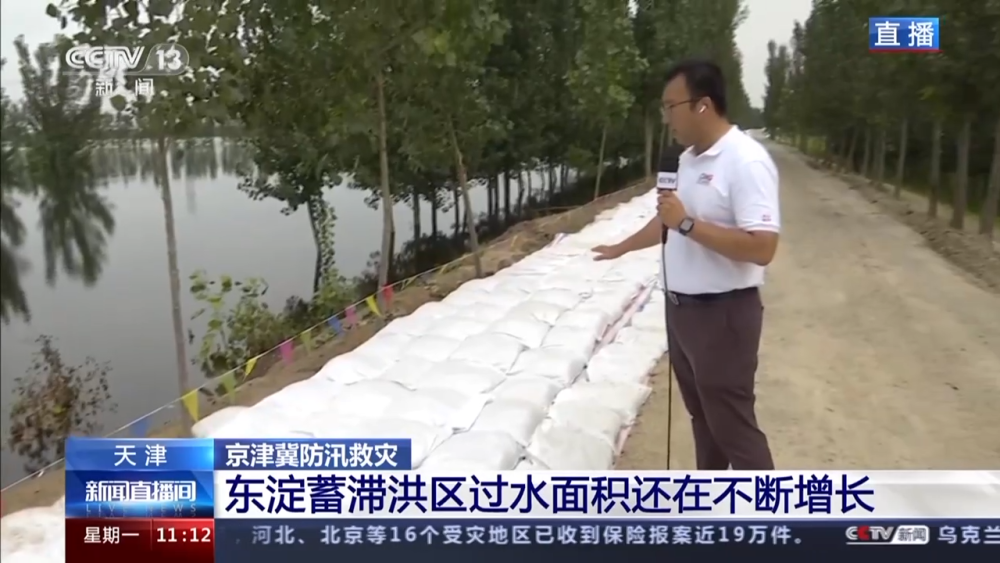 總臺(tái)央視記者 黃達(dá):我現(xiàn)在所在的位置是靜海區(qū)臺(tái)頭鎮(zhèn)的圍埝上。截至今天9時(shí),大清河水位相較昨天同一時(shí)間上漲0.4米。目前水位還在繼續(xù)上漲,距離圍埝的頂端還有1米左右的距離。