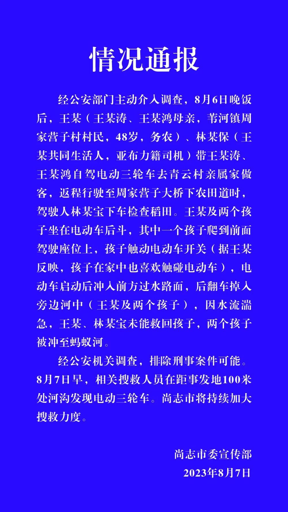中新網(wǎng)8月8日電 據(jù)尚志市委宣傳部微信公眾號(hào)消息,經(jīng)公安部門主動(dòng)介入調(diào)查,8月6日晚飯后,王某(王某濤、王某鴻母親,葦河鎮(zhèn)周家營(yíng)子村村民,48歲,務(wù)農(nóng))、林某保(王某共同生活人,亞布力籍司機(jī))帶王某濤、王某鴻自駕電動(dòng)三輪車去青云村親屬家做客,返程行駛至周家營(yíng)子大橋下農(nóng)田道時(shí),駕駛?cè)肆帜硨毾萝嚈z查稻田。王某及兩個(gè)孩子坐在電動(dòng)車后斗,其中一個(gè)孩子爬到前面駕駛座位上,孩子觸動(dòng)電動(dòng)車開關(guān)(據(jù)王某反映,孩子在家中也喜歡觸碰電動(dòng)車),電動(dòng)車啟動(dòng)后沖入前方過(guò)水路面,后翻車掉入旁邊河中(王某及兩個(gè)孩子),因水流湍急,王某、林某寶未能救回孩子,兩個(gè)孩子被沖至螞蟻河。