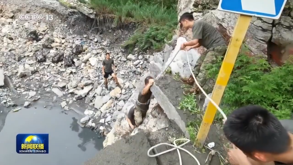某抗洪搶險(xiǎn)應(yīng)急通信保障任務(wù)分隊(duì)指揮員 于林平:準(zhǔn)備上去的時(shí)候,下面的那個(gè)路突然塌方了,我整個(gè)人就像吊單杠一樣,整個(gè)給我拉直了,然后我的戰(zhàn)友把我拉上來(lái)了。下面全部是碎石,水流非常湍急,非常有可能會(huì)被沖下去。