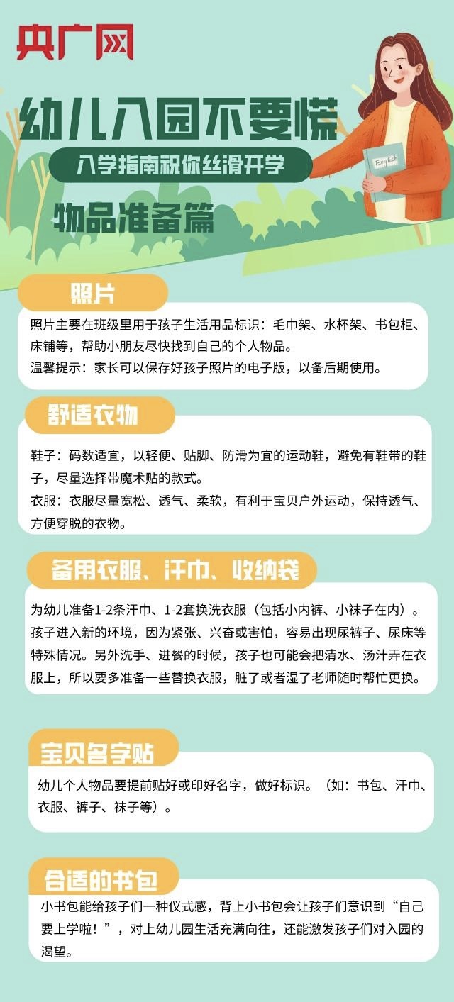 央廣網(wǎng)北京8月27日消息 幼兒園是人生的第一所學(xué)校,在這里,孩子們將開啟真正的學(xué)習(xí)生活和社會生活??梢哉f,這一階段對于孩子的性格塑造和習(xí)慣養(yǎng)成都有著十分重要的影響。那么幼兒入園前,新手爸媽應(yīng)該做好哪些準(zhǔn)備工作呢?別慌,這份入學(xué)指南請收藏!