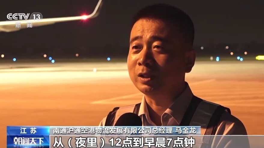 南通滬通空港物流發(fā)展有限公司總經(jīng)理 馬金龍:從夜里12點(diǎn)到早晨7點(diǎn)鐘,陸續(xù)有8個航班離港,目的站主要是廣州、深圳、北京幾個機(jī)場。