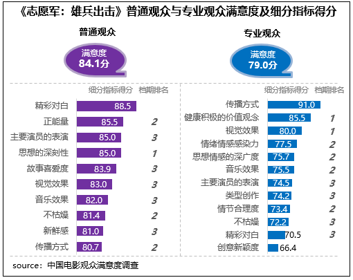 陳凱歌執(zhí)導(dǎo)的抗美援朝題材影片《志愿軍:雄兵出擊》觀眾滿意度83.8分,影片主題立意與國慶氛圍貼合,思想性得分85.0分,影片全景式呈現(xiàn)抗美援朝歷史,所傳遞的愛國精神和英雄氣概震撼人心,有85%的受訪觀眾表示在觀賞影片后感動不已。
