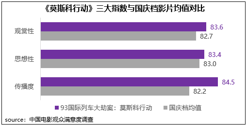 《莫斯科行動》根據(jù)20世紀(jì)90年代跨境追捕搶劫案犯案件改編,在真實(shí)社會事件基礎(chǔ)之上有機(jī)融入商業(yè)化要素,三大指數(shù)得分均超83分。