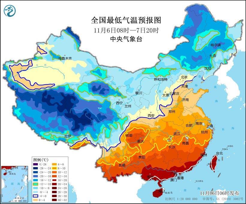 寒潮藍色預(yù)警:受強冷空氣影響,預(yù)計,11月6日08時至11月7日20時,內(nèi)蒙古東部、東北地區(qū)中南部、黃淮東部、江淮東部和南部、江南東部等地大部將先后降溫6~8℃,其中,內(nèi)蒙古東南部、東北地區(qū)中南部等地部分地區(qū)降溫可達10~14℃。最低氣溫0℃線將位于河北北部、天津北部、山西南部至陜西關(guān)中平原、甘肅東南部一帶,長江中下游以北地區(qū)有4~6級偏北風,陣風7~9級,局地可達10級;6日至7日夜間,渤海、黃海、東海等海域有7~8級風,最大陣風9~11級。