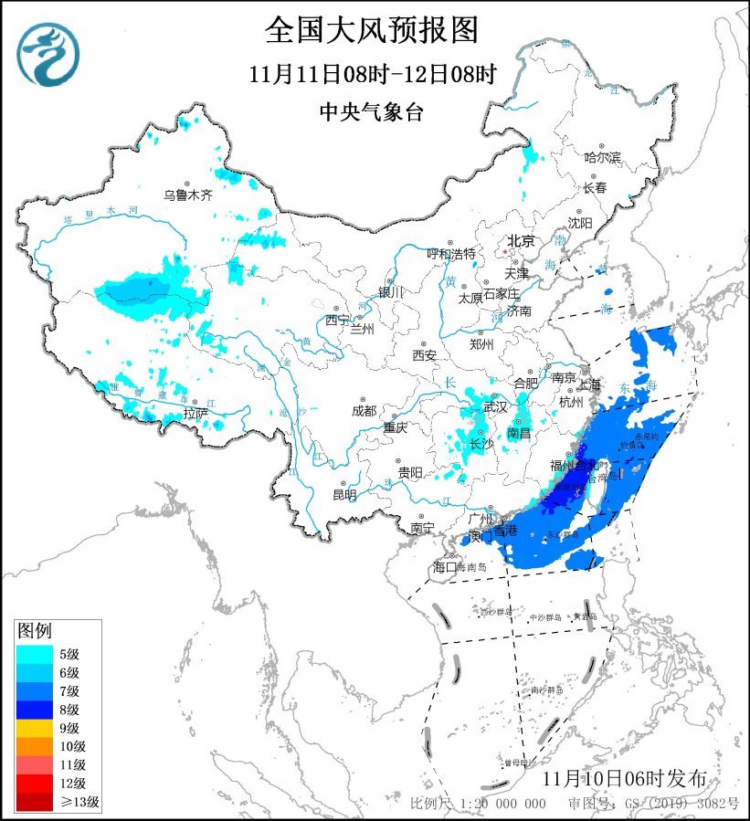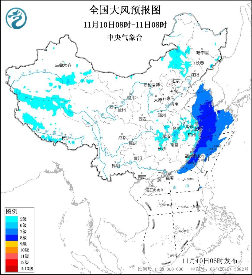 預計,11月10日08時至11日08時,內蒙古中東部、遼寧西部、安徽中南部、河南南部、江蘇南部、上海、湖北南部、湖南東北部、江西北部、浙江北部及東部沿海、福建沿海、臺灣島沿海等地有5~6級、陣風7~8級的大風;黃海大部海域、東海大部海域、臺灣海峽、臺灣以東洋面偏北海域、南海東北部偏北海域將有7~8級、陣風9~10級的大風。