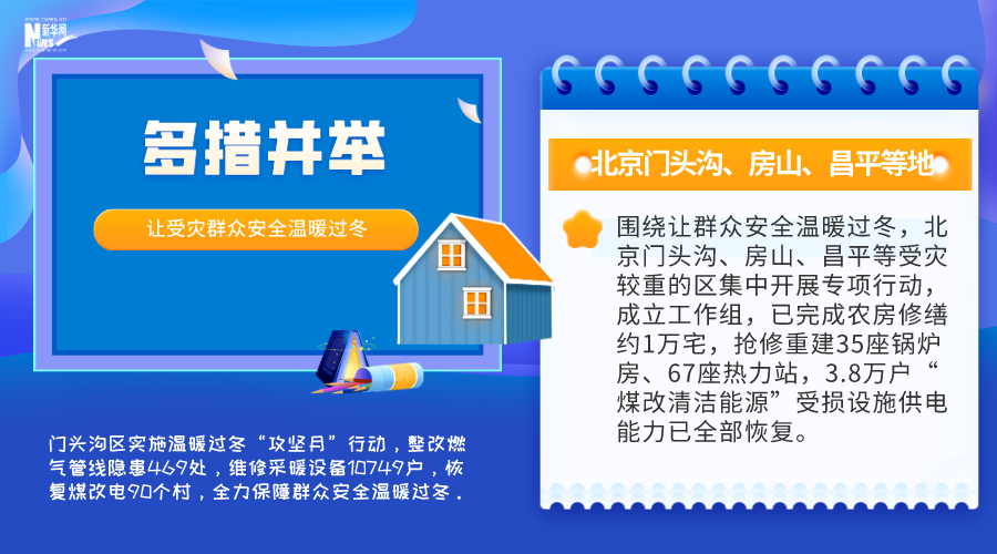 圍繞讓群眾安全溫暖過冬,北京門頭溝、房山、昌平等受災較重的區(qū)集中開展專項行動,成立工作組,已完成農(nóng)房修繕約1萬宅,搶修重建35座鍋爐房、67座熱力站,3.8萬戶“煤改清潔能源”受損設施供電能力已全部恢復。