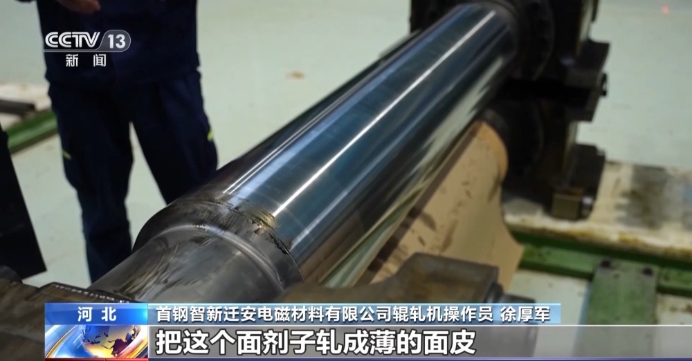 首鋼智新遷安電磁材料有限公司輥軋機操作員 徐厚軍:這就是軋制和帶鋼直接接觸的工作輥,如果說家里搟面的話,這就是我們的搟面杖。那個鋼鐵材料就相當于面劑子,我們就用這個搟面杖,通過擠壓,把這個面劑子軋成薄的面皮。6個搟面杖串起來,一遍就軋出來了。生產(chǎn)效率比傳統(tǒng)生產(chǎn)方法高了8倍到10倍,這條機組軋制速度是1500米每分鐘,相當于高速公路上以時速90公里開的小車一直在跑。