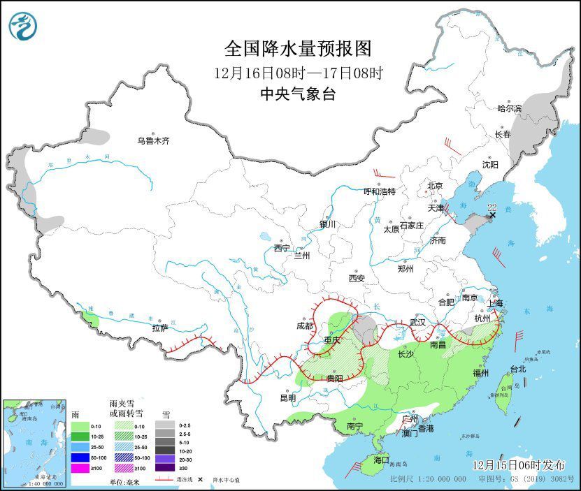 12月15日08時(shí)至16日08時(shí),西北地區(qū)東南部、內(nèi)蒙古東部、東北地區(qū)中東部和南部、黃淮、江淮大部、江漢等地部分地區(qū)有小雪或雨夾雪,其中,吉林東部、遼寧東北部、山東北部等地部分地區(qū)有中到大雪,局地暴雪(10~12毫米)。江南、西南地區(qū)東部、華南、臺(tái)灣島等地部分地區(qū)有小到中雨,其中,江西北部、浙江中南部、福建北部等地部分地區(qū)有大雨(25~45毫米)。內(nèi)蒙古西南部、遼東半島、江蘇北部等地部分地區(qū)有4~6級(jí)風(fēng),其中,青海南部部分地區(qū)有6~7級(jí)風(fēng)。