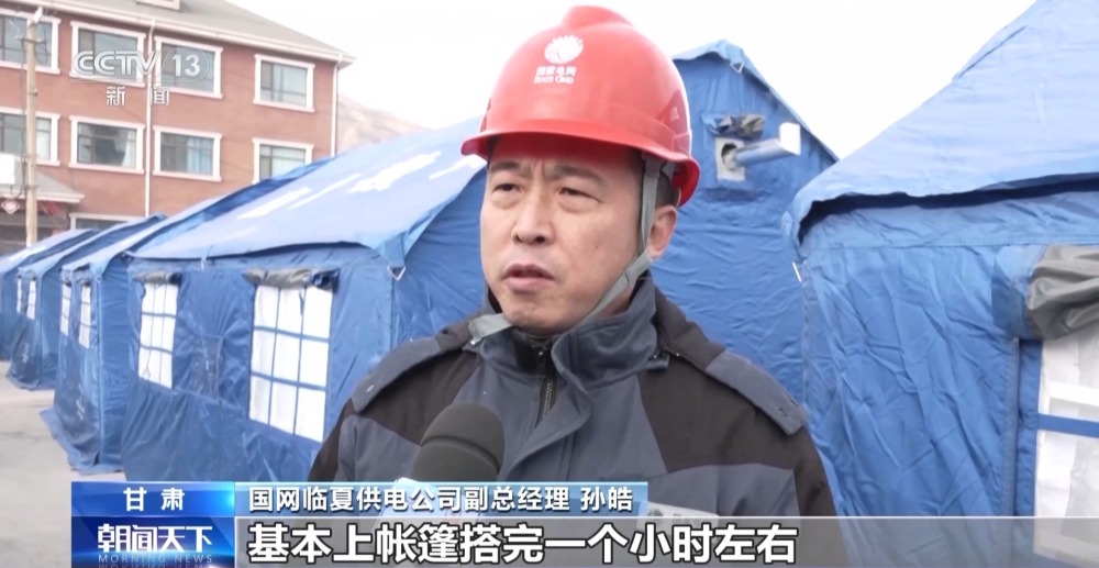 國(guó)網(wǎng)臨夏供電公司副總經(jīng)理 孫皓:基本上帳篷搭完一個(gè)小時(shí)左右,我們就能把電通上,因?yàn)槊總€(gè)點(diǎn)我們都有3到10名工作人員在跟進(jìn),充分地調(diào)動(dòng)了我們所有的人員和力量,把這項(xiàng)工作放在最重要的位置上,把老百姓的電先供好。