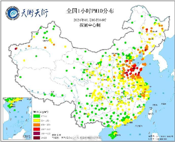 據(jù)中國氣象局氣象探測中心綜合觀測產(chǎn)品系統(tǒng)(天衡天衍)產(chǎn)品顯示,根據(jù)1月3日04時全國時均PM10、PM2.5分布圖,河北、山東、長三角、川渝等地區(qū)PM10、PM2.5濃度較高。最大PM10出現(xiàn)在山東青島站,為285微克/立方米。最大PM2.5出現(xiàn)在山東淄博站,為272.6微克/立方米。以上地區(qū)PM10大都超過150微克/立方米;PM2.5大都超過115微克/立方米。