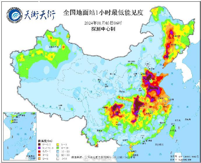 3日06時,河北南部、山東、安徽、江蘇、華中、東北、四川東部、重慶等地能見度較低,局地能見度低于500米,最低能見度是24米,發(fā)生在河北臨西。