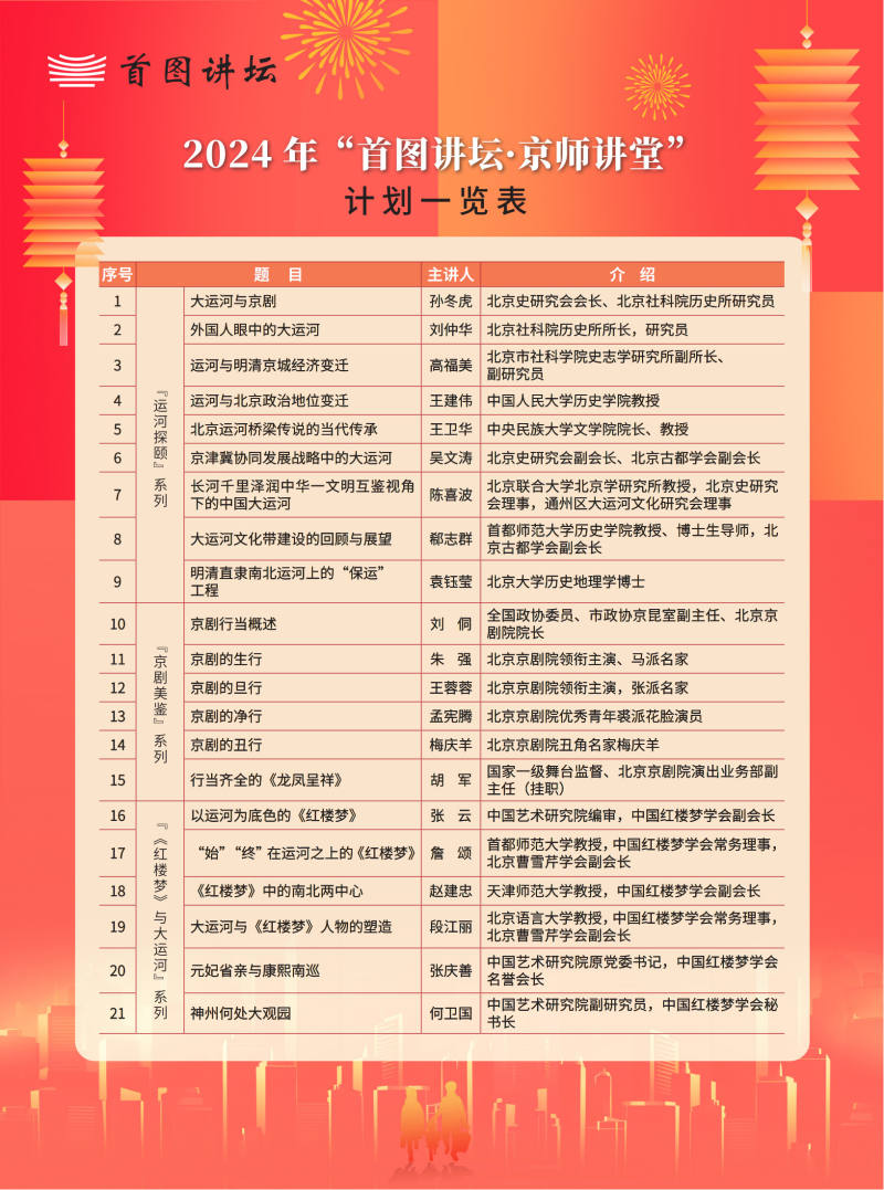 北京史研究會會長孫冬虎發(fā)布“京師講堂”2024年度主題講座計劃。全年近50場講座,包括北京胡同四合院、三山五園、明清北京商業(yè)、龍年說龍等歷史文化與社會生活主題,還有四項(xiàng)專題系列講座——“運(yùn)河探頤”系列將以大運(yùn)河的歷史變遷與運(yùn)河文化的挖掘、研究、傳承為焦點(diǎn),展示北京城市發(fā)展與大運(yùn)河的密切關(guān)系;“京劇美鑒”系列致力于讓聽眾體味京劇國粹的獨(dú)特風(fēng)韻與文化價值;“《紅樓夢》與大運(yùn)河”系列將挖掘《紅樓夢》與世界文化遺產(chǎn)大運(yùn)河之間的密切關(guān)聯(lián);“清朝宮廷”系列將還原清代宮廷生活的真實(shí)場景,提升聽眾關(guān)于清代歷史與文化的準(zhǔn)確認(rèn)知。