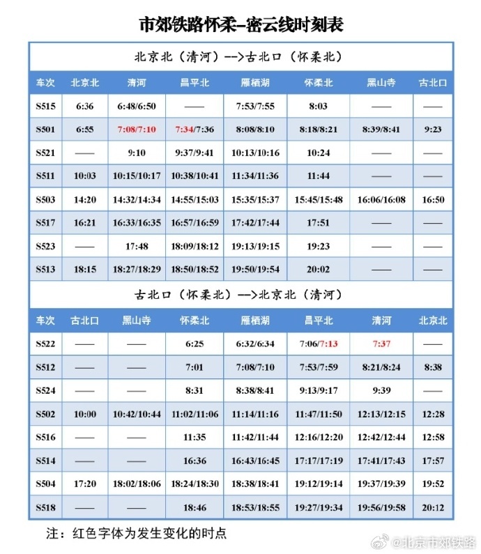 中新網(wǎng)1月9日電 據(jù)北京市郊鐵路官方微博消息,2024年1月10日起,北京市郊鐵路懷柔-密云線列車開行時點調(diào)整,具體列車時刻表如下圖所示: