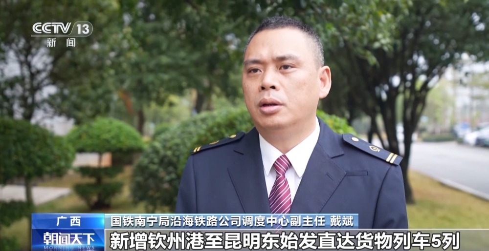 國鐵南寧局沿海鐵路公司調(diào)度中心副主任 戴斌:新增欽州港至昆明東始發(fā)直達貨物列車5列,新增防城港至德保、靖西、田東等方向貨物列車4列,不斷延伸西部陸海新通道鐵海聯(lián)運班列通達區(qū)域。