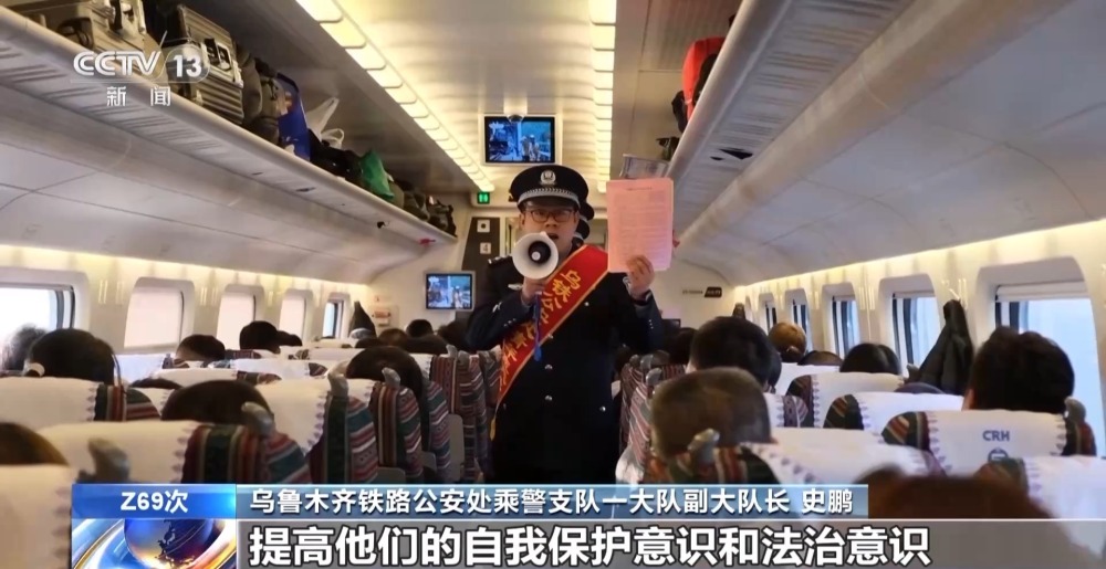 烏魯木齊鐵路公安處乘警支隊一大隊副大隊長 史鵬:希望通過這種方式,能夠讓乘坐我們列車的旅客提高他們的自我保護(hù)意識和法治意識,確保旅客們平安出行。