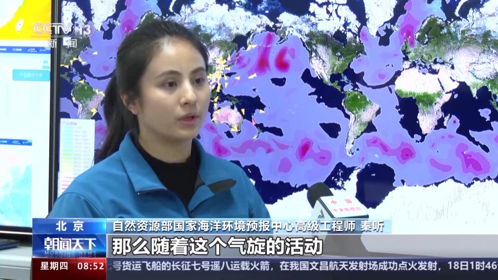 自然資源部國家海洋環(huán)境預報中心高級工程師 秦聽:那么隨著這個氣旋的活動,就會造成這種南半球的中低緯度的暖濕氣流,與南極的冷氣團之間的碰撞,所形成的這種極地的降雪,以及海霧這種低能見度的一個情況,并且會引起它作業(yè)海區(qū)的一個大風、海浪的這種高海況天氣。