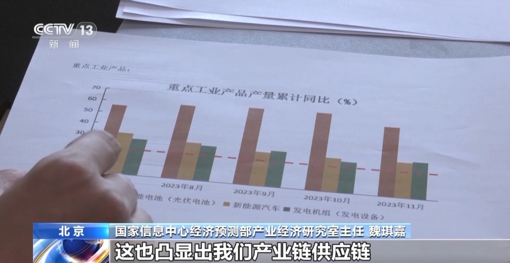 國家信息中心經(jīng)濟(jì)預(yù)測部產(chǎn)業(yè)經(jīng)濟(jì)研究室主任 魏琪嘉:像這樣的產(chǎn)品實(shí)現(xiàn)了兩位數(shù)的增長的這種態(tài)勢,其實(shí)對(duì)于一個(gè)經(jīng)濟(jì)體來講是實(shí)屬不易的。這也凸顯出我們產(chǎn)業(yè)鏈供應(yīng)鏈配套能力的大幅提升。產(chǎn)品背后蘊(yùn)含的是技術(shù)、要素的優(yōu)化組合,催生出新的生產(chǎn)能力,其實(shí)也是我們經(jīng)濟(jì)發(fā)展中的這種亮點(diǎn)。