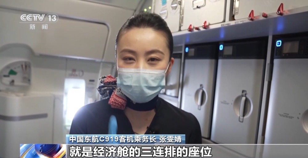 中國(guó)東航C919客機(jī)乘務(wù)長(zhǎng) 張?chǎng)╂海?/strong>我們非常特別的一點(diǎn)就是經(jīng)濟(jì)艙的三連排的座位,它要比其他的飛機(jī)中間座位更寬一點(diǎn),寬1.5厘米。