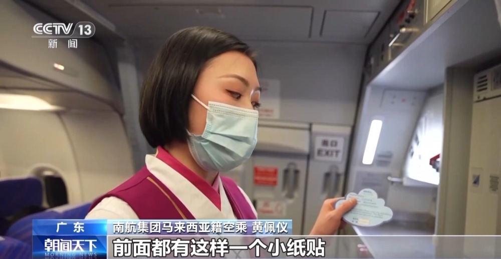 南航集團(tuán)馬來西亞籍空乘 黃佩儀:現(xiàn)在又到了春運(yùn)的時(shí)期,我們領(lǐng)資料箱的時(shí)候,特地問一下能不能多給我們兩包,盡量保證每個(gè)睡覺的旅客,前面都有這樣一個(gè)小紙貼。