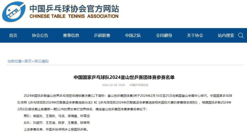 北京時(shí)間2月6日,中國乒協(xié)官網(wǎng)發(fā)布了中國國家乒乓球隊(duì)釜山世乒賽團(tuán)體賽參賽名單。中國國家乒乓球隊(duì)依照《乒乓球項(xiàng)目2024年巴黎奧運(yùn)會參賽選拔辦法》和《乒乓球項(xiàng)目2024年巴黎奧運(yùn)會參賽選拔相關(guān)國際大賽的參賽報(bào)名規(guī)則》,根據(jù)國際乒聯(lián)2024年2月6日(報(bào)名截止前最新一期)公布的男女單打世界排名,確定釜山世乒賽團(tuán)體賽參賽名單如下: