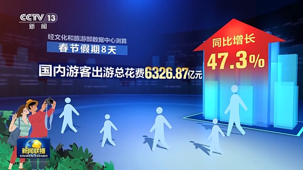 今年這個春節(jié),人們走得更遠,游玩時間更長。出行平臺分析訂單數(shù)據(jù)后發(fā)現(xiàn),假期里,超過一半的人選擇跨省出游,其中三成以上的人選擇兩個及以上目的地,中國游客出境目的地覆蓋全球1700多個城市,個性化出游、定制化消費成為新趨勢。在陜西景區(qū)里看一場沉浸式演出,游客既是觀眾,又是演員,全新消費體驗帶來上億元演出收入;四川把火鍋文化和特色觀光結(jié)合在一起,帶動特色餐飲消費熱度不斷。節(jié)日里,滕王閣景區(qū)北園向公眾開放,通過濱江水道,游客可以直接穿行老城區(qū)的商鋪。經(jīng)文化和旅游部數(shù)據(jù)中心測算,春節(jié)假期八天,全國國內(nèi)旅游出游4.74億人次,同比增長34.3%,國內(nèi)游客出游總花費6326.87億元,同比增長47.3%。