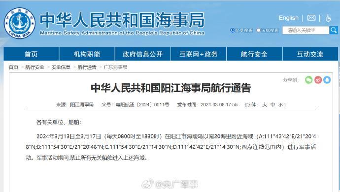 陽(yáng)江海事局發(fā)布航行警告,3月13日至3月17日,每天8時(shí)至18時(shí)30分,在陽(yáng)江市海陵島以南20海里附近海域進(jìn)行軍事活動(dòng),禁止駛?cè)搿?/p>