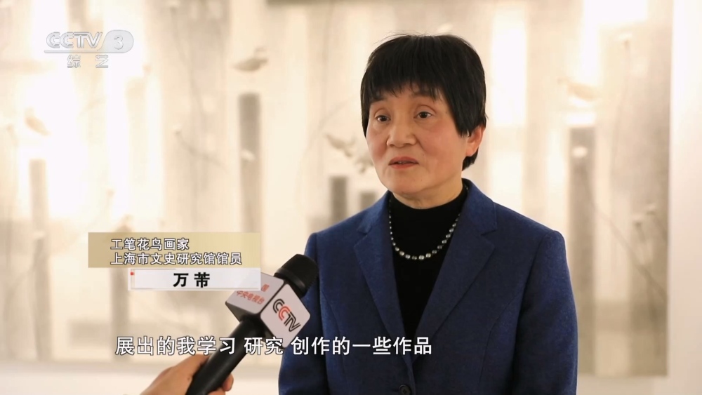 工筆花鳥畫家 上海市文史研究館館員 萬(wàn)芾:實(shí)際上展覽的這個(gè)時(shí)間度是跨越了有四十多年,展出的我學(xué)習(xí)、研究、創(chuàng)作的一些作品。我是和策展人一起商量,把自己從學(xué)習(xí)到成為一個(gè)女性藝術(shù)家這個(gè)經(jīng)歷做一個(gè)梳理,以及我畫的一些跨界的一些創(chuàng)作,甚至還有我和學(xué)生合作的一些衍生品,這是三個(gè)部分,完全不一樣的內(nèi)容來(lái)展現(xiàn)給大家。