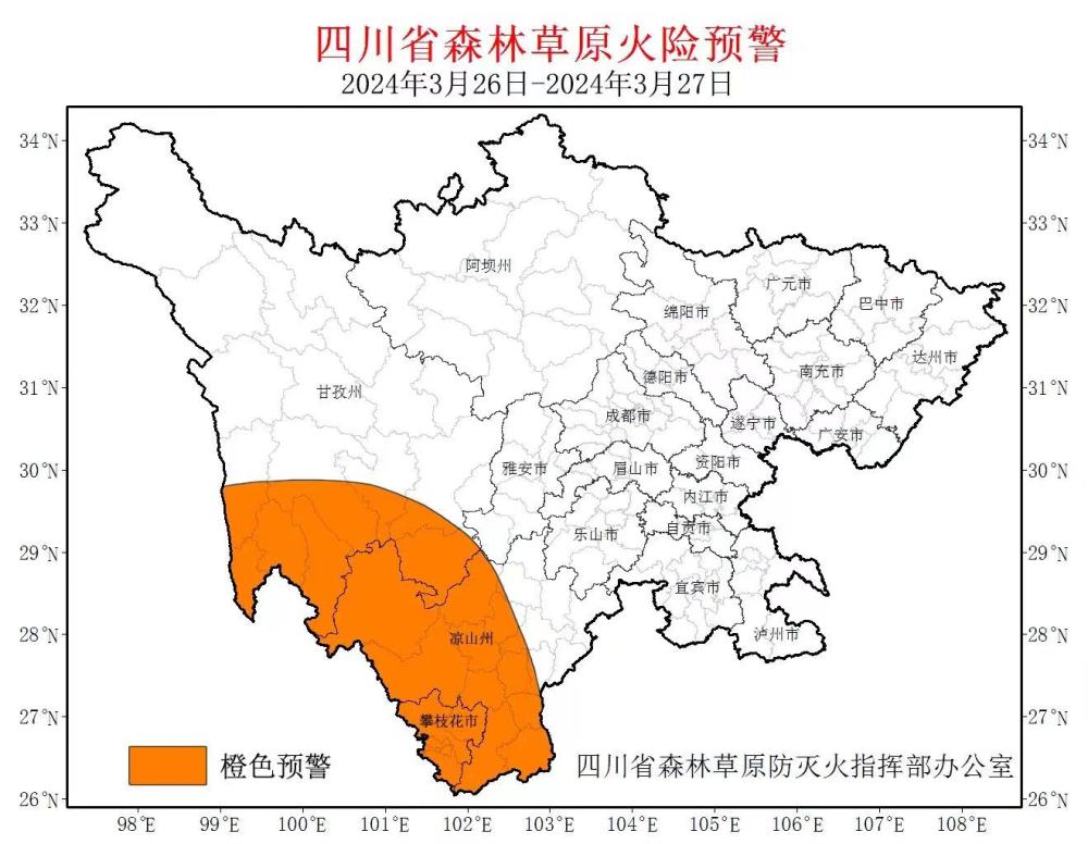 經(jīng)四川省森防指辦公室與四川省林草局、四川氣象局及相關(guān)地區(qū)會商,預(yù)計(jì)3月26日至27日攀枝花市,甘孜州東部局地和南部,涼山州西部、中部和南部(涉及21個(gè)縣級行政單位)森林草原火險(xiǎn)等級將維持在高度危險(xiǎn)級別。經(jīng)研究,延長省森防指辦公室3月21日發(fā)布的高森林草原火險(xiǎn)橙色預(yù)警至3月27日,預(yù)警范圍不變。