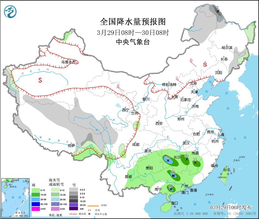 3月29日8時至30日8時,內蒙古東北部、黑龍江西北部和東部、吉林東部、西藏東部、青海西部等地部分地區(qū)有小到中雪或雨夾雪,其中,黑龍江西北部部分地區(qū)有大雪(5~7毫米)。湖南西部和東部、江西中南部、廣西東部、廣東中西部等地部分地區(qū)有中到大雨,其中,廣西東北部部分地區(qū)有暴雨(50~70毫米)。內蒙古東南部和西北部、河北北部等地部分地區(qū)有4~6級風。