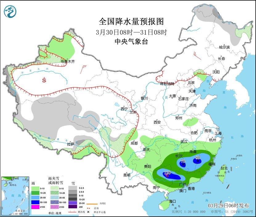 3月30日8時至31日8時,黑龍江北部、新疆南疆高海拔山區(qū)、西藏大部、青海西部、川西高原南部等地部分地區(qū)有小到中雪或雨夾雪。湖南中南部、江南中南部、福建大部、廣西西北部、廣東大部等地部分地區(qū)有中到大雨,其中,湖南東南部、江西西南部和東部、福建西部、廣西東北部、廣東西部等地部分地區(qū)有暴雨或大暴雨(100~120毫米)。內蒙古東南部、新疆東部等地部分地區(qū)有4~5級風。