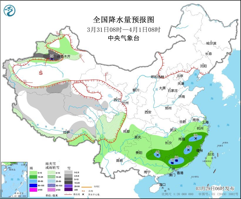 3月31日8時至4月1日8時,新疆沿天山高海拔地區(qū)、西藏中北部、青海西部、川西高原等地部分地區(qū)有小到中雪或雨夾雪,其中,新疆沿天山地區(qū)和伊犁河谷等地部分地區(qū)有大到暴雪,局地大暴雪(20~25毫米)。浙江南部、江西東部和南部、湖南南部、貴州東南部、廣西東北部、廣東中北部、福建等地部分地區(qū)有中到大雨,其中,廣東北部等地部分地區(qū)有暴雨(50~80毫米)。新疆南疆盆地和東部、甘肅河西等地部分地區(qū)有4~6級風。