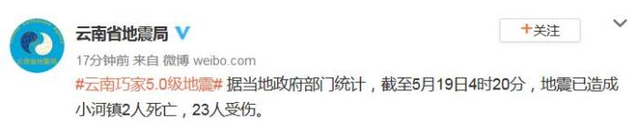 中新網(wǎng)5月19日電 據(jù)云南省地震局官方微博消息,據(jù)當?shù)卣块T統(tǒng)計,截至5月19日4時20分,地震已造成小河鎮(zhèn)2人死亡,23人受傷。