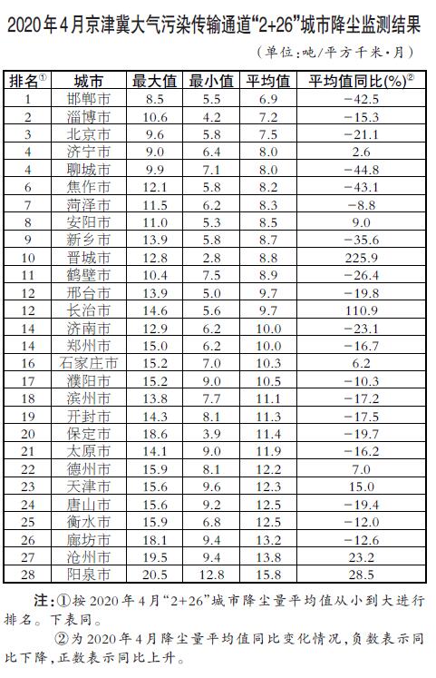 生態(tài)環(huán)境部今日向媒體公布了2020年4月京津冀大氣污染傳輸通道“2+26”城市(以下簡稱“2+26”城市)和汾渭平原11城市降塵監(jiān)測結(jié)果。
