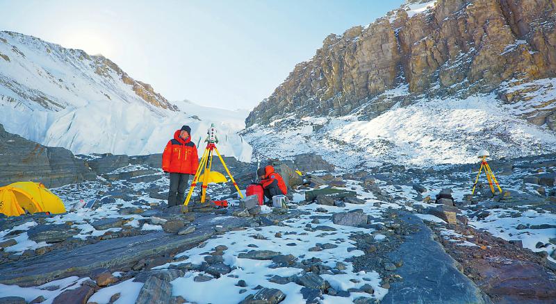 更多測(cè)繪人的日常被記錄下來(lái)。史志剛,重力測(cè)量組組長(zhǎng),除完成珠峰地區(qū)加密重力測(cè)量之外,他還完成海拔5200米至6000米所有6個(gè)交會(huì)點(diǎn)的重力測(cè)量,成為本次珠峰高程測(cè)量項(xiàng)目中,唯一一個(gè)走遍所有交會(huì)測(cè)量點(diǎn)的人。王戰(zhàn)勝,在本次珠峰高程測(cè)量中負(fù)責(zé)高程導(dǎo)線、GNSS測(cè)量和東絨3點(diǎn)的交會(huì)測(cè)量工作。他攀冰跨河,4次到達(dá)海拔最高的東絨3交會(huì)點(diǎn)。鄭林,大本營(yíng)交會(huì)測(cè)量組組長(zhǎng),帶著年輕隊(duì)員武光偉克服了距離峰頂遠(yuǎn)、交會(huì)測(cè)量難度大的困難,完成珠峰大本營(yíng)的交會(huì)測(cè)量及基準(zhǔn)站值守工作……
