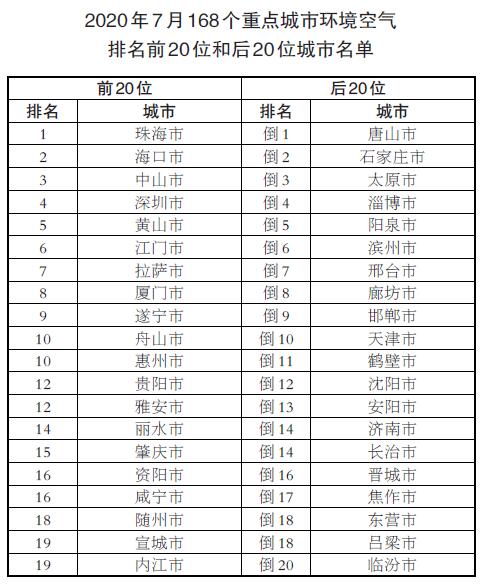 7月,168個重點(diǎn)城市中唐山、石家莊和太原市等城市空氣質(zhì)量相對較差;珠海、??诤椭猩绞械瘸鞘锌諝赓|(zhì)量相對較好。
