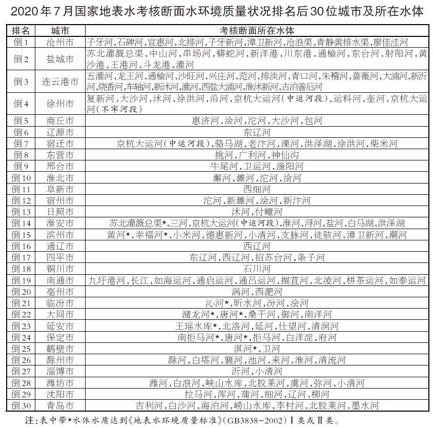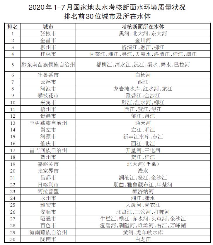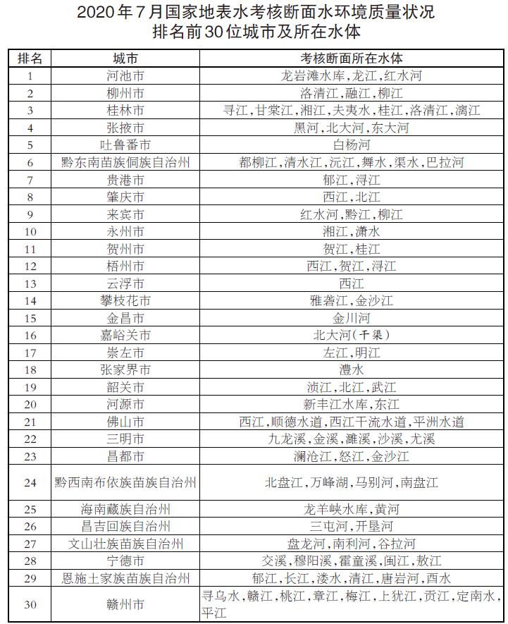 參加排名的全國地級及以上城市,覆蓋2050個國控斷面(其中1940個為國家地表水考核斷面,110個為入??刂茢嗝妫?月,全國地級及以上城市中,河池、柳州、桂林等30個城市國家地表水考核斷面水環(huán)境質(zhì)量相對較好,滄州、鹽城、連云港等30個城市國家地表水考核斷面水環(huán)境質(zhì)量相對較差;1-7月,全國地級及以上城市中,張掖、金昌、柳州等30個城市國家地表水考核斷面水環(huán)境質(zhì)量相對較好,銅川、滄州、邢臺等30個城市國家地表水考核斷面水環(huán)境質(zhì)量相對較差。