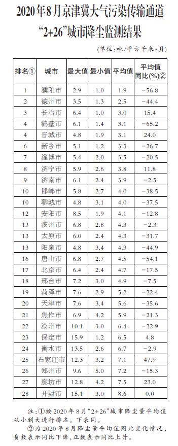 生態(tài)環(huán)境部公布8月京津冀大氣污染傳輸通道 “2+26”城市和汾渭平原11城市降塵監(jiān)測結果