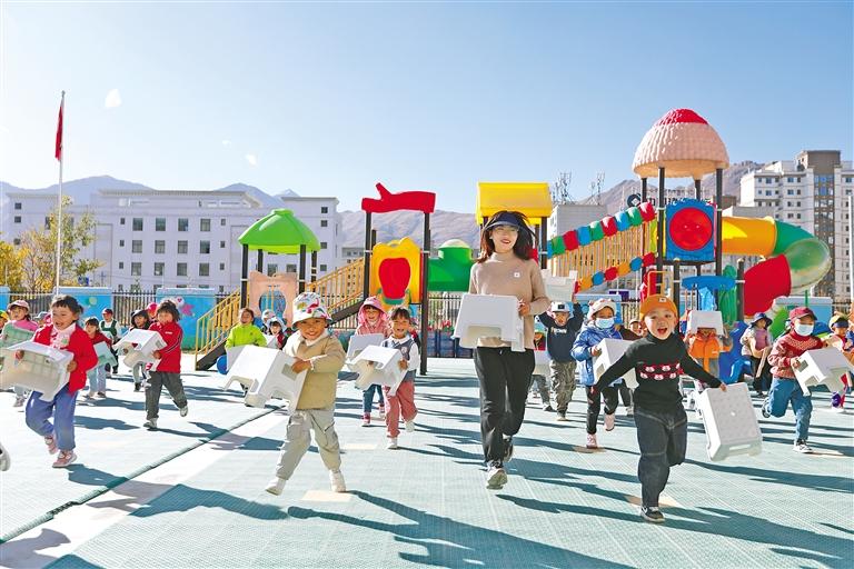 拉薩市江蘇實(shí)驗幼兒園的孩子們與江蘇援藏老師在一起做游戲。