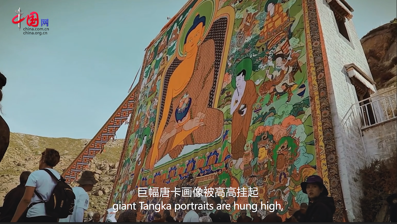 During the Shoton Festival, giant Tangka portraits are hung high, revealing their magnificent appearance.