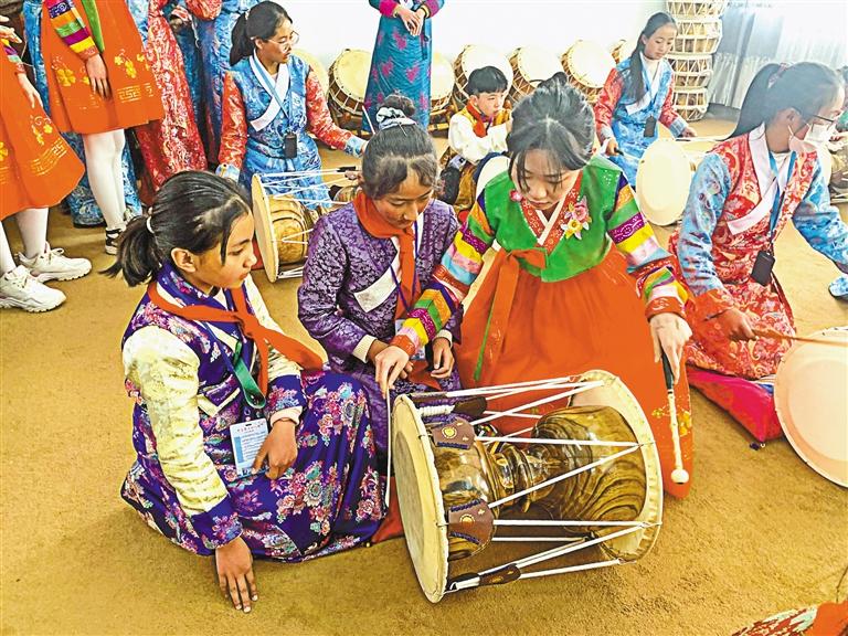在“吉藏一家親”冬令營活動中,日喀則學(xué)生在朝鮮族學(xué)生指導(dǎo)下學(xué)習(xí)打鼓。