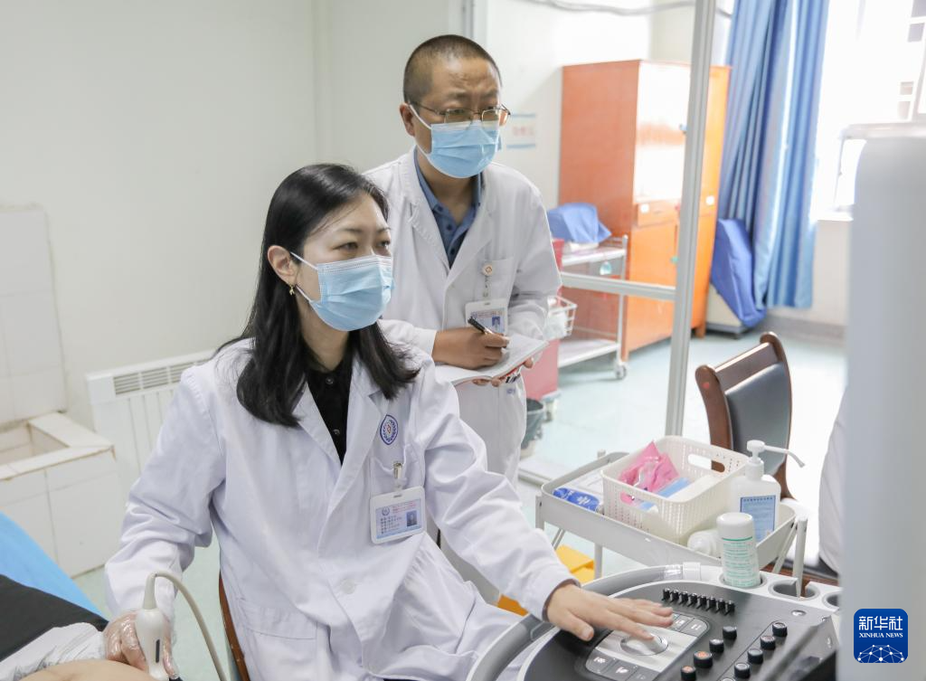 在西藏自治區(qū)人民醫(yī)院,徐鐘慧(左)與徒弟宋彬彬在為患者進行超聲檢查(7月12日攝)。新華社發(fā)