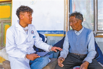 村醫(yī)索朗丹增(左)為村民進行健康檢查。徐馭堯 攝