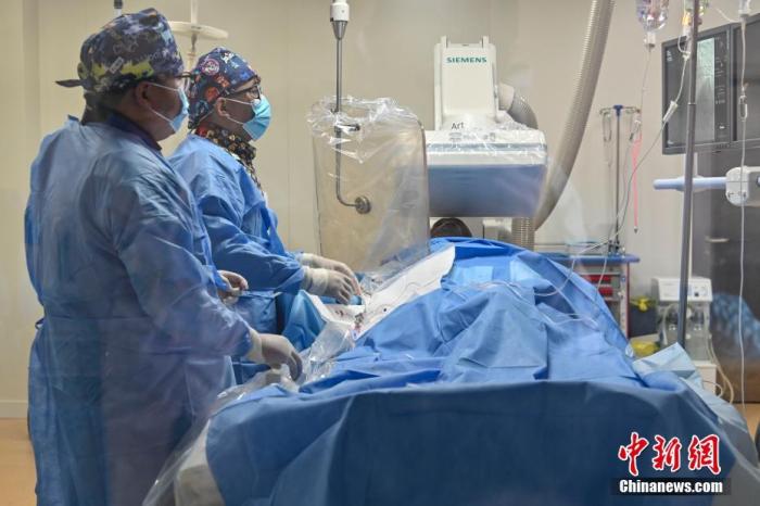 圖為2020年12月22日,西藏林芝市人民醫(yī)院的介入手術(shù)室里,心內(nèi)科醫(yī)生普布扎西(左二)為一名冠心病患者進(jìn)行冠狀動(dòng)脈造影及支架植入術(shù)。 中新社記者 陳驥旻 攝