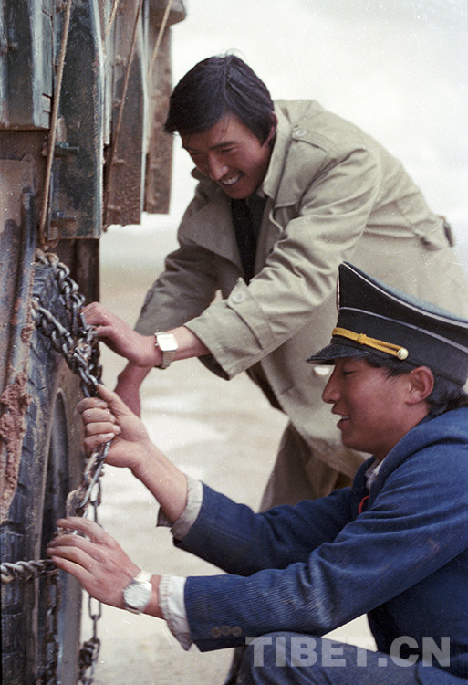 這是郵政人員正在為郵車的輪胎綁防滑鏈條,以便郵車順利通過泥濘路。上世紀(jì)七八十年代,由于藏北西部交通不便,每半月通郵一次的郵車常常會(huì)在草原上遭遇陷車等困難(唐召明1987年攝)