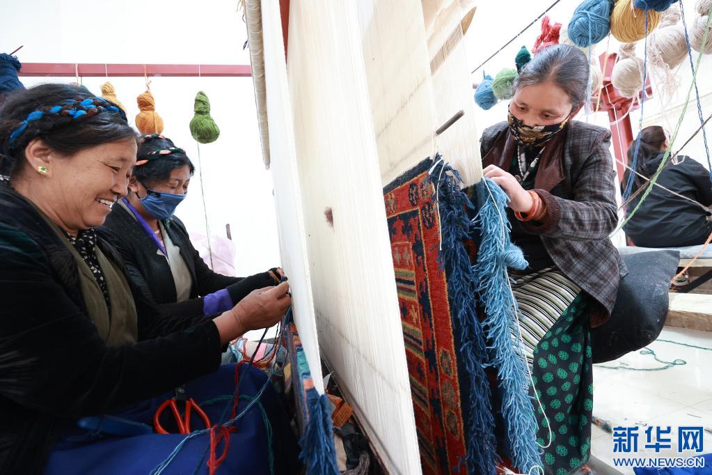 山南市瓊結(jié)縣農(nóng)牧民在襄陽援藏工作隊引進(jìn)的西藏薩喜欽布公司編織藏毯(2021年6月18日攝)。(受訪者供圖)