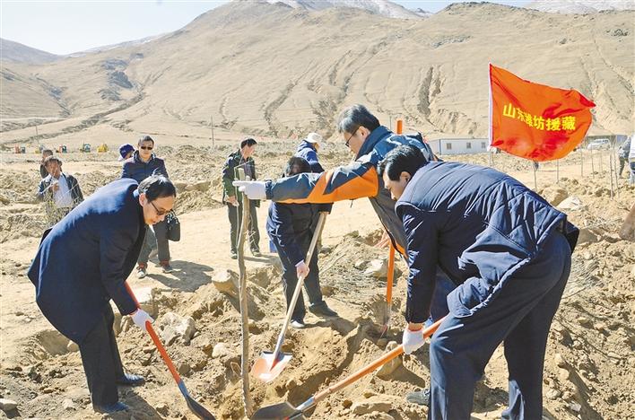 2012年,由山東省濰坊市第六批援藏工作隊(duì)具體負(fù)責(zé)的“湘河谷”經(jīng)濟(jì)林生態(tài)產(chǎn)業(yè)扶貧項(xiàng)目在南木林縣實(shí)施。項(xiàng)目集旅游觀光、苗木生產(chǎn)、林產(chǎn)品深加工、果品銷售于一體,總投資20億元,規(guī)劃面積10萬(wàn)畝。最終形成地方政府、當(dāng)?shù)厝罕?、企業(yè)共同受益的“全贏”局面。 圖為山東省濰坊市援藏干部正在栽植經(jīng)濟(jì)林木(2012年3月12日攝)。 (本版圖片均為資料圖片)