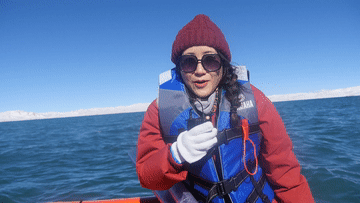 說(shuō)不害怕那是假的,我時(shí)刻準(zhǔn)備著被大浪拍進(jìn)湖里去。心里想著,反正有救生衣,就算真掉湖里了,也不至于淹死吧,頂多冷點(diǎn)兒!后來(lái),我把這個(gè)想法告訴同行的專家時(shí),他們搖著頭說(shuō),真掉下去可不得了。這個(gè)氣溫可是會(huì)凍死人的。