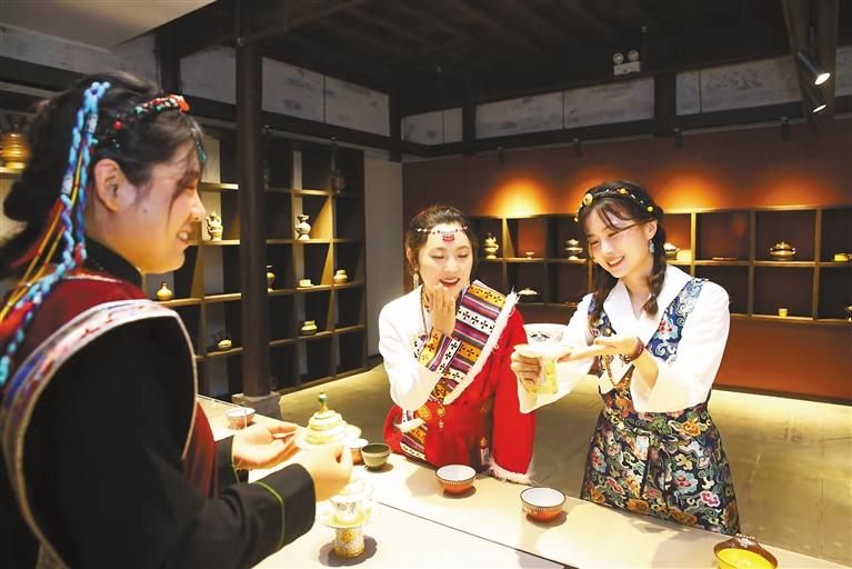 充滿墨竹風(fēng)情的藏式生活館吸引了不少市民與游客,走進(jìn)館內(nèi),整齊陳列的塔巴陶瓷、藏靴、藏式擺件、藏式水果托盤、唐卡等非物質(zhì)文化遺產(chǎn)作品和文創(chuàng)延伸產(chǎn)品,色彩濃郁、古樸典雅,原汁原味地呈現(xiàn)了藏式民族特色生活中所涵蓋的細(xì)節(jié)。