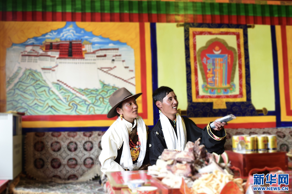 9月12日,村民堅參羅布(右)和妻子在看電視。新華網(wǎng) 旦增努布攝